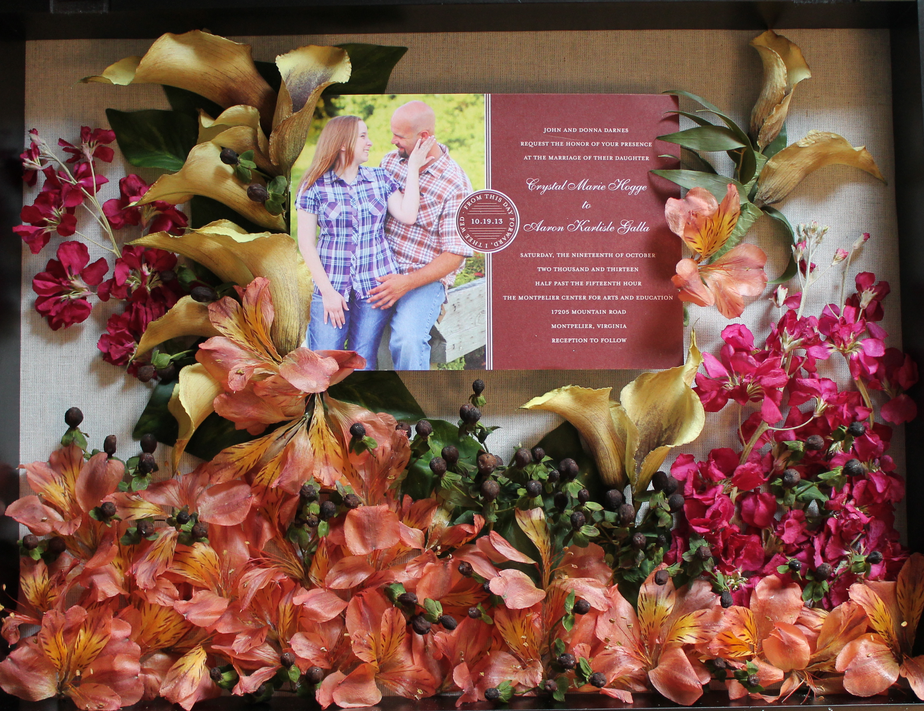 I met Crystal in college and we have stayed friends ever since. I am so happy for her that she married her high school sweetheart and had the beautiful wedding that she always wanted. The wedding was held at the Montpelier Center for the Arts in Montpelier, VA on a not so ideal weather day. Even though it was raining and she didn’t get to have the outdoor wedding that she really wanted, it ended up being perfect at a very unique and lovely indoor location. Her bouquet was arranged by Strange’s flowers in Richmond, VA and was gorgeous but also very challenging from a preservation standpoint. The tiger lilies still amaze me every time I look at them by how real they look after being preserved. Unfortunately, they are so thin and fragile that it made them very difficult to work with. I love this arrangement more every time I look at it and I hope Crystal loves it even more than I do and cherishes it forever.